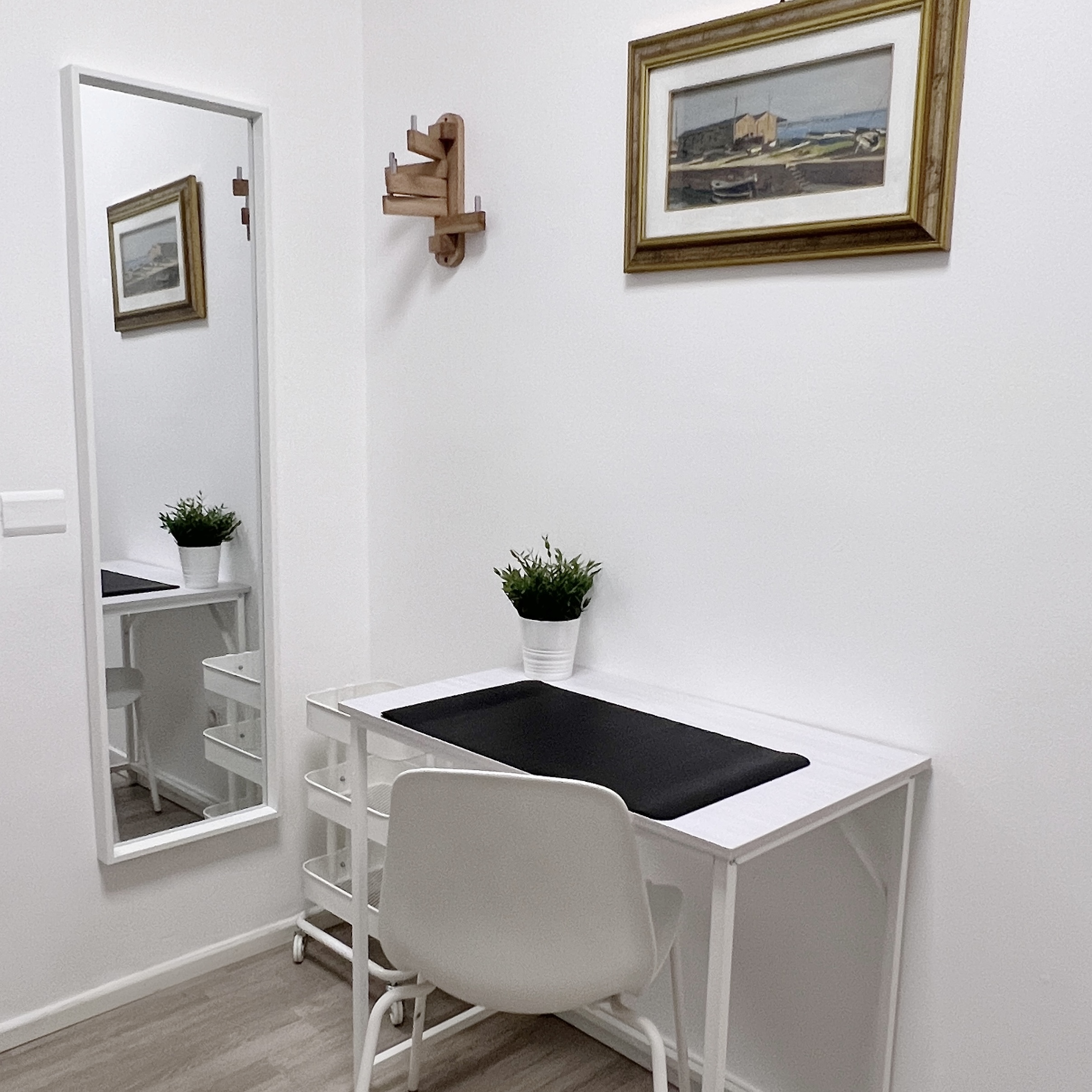 Troverai lo studio equipaggiato con un lettino elettrico con i suoi lenzuolini di carta, sgabello, lavamani con carta asciugamani e sapone, una cassettiera, un appendiabiti, una lampada, un telecomando per l’aria condizionata, un purificatore d’aria con filtri HEPA (assente nello Studio Cinque) che puoi accendere e regolarne l’intensità a tuo piacimento, una cassa wireless per riprodurre la tua musica, una scrivania (assente nello Studio Cinque) e tre poltrone (due nello Studio Cinque).