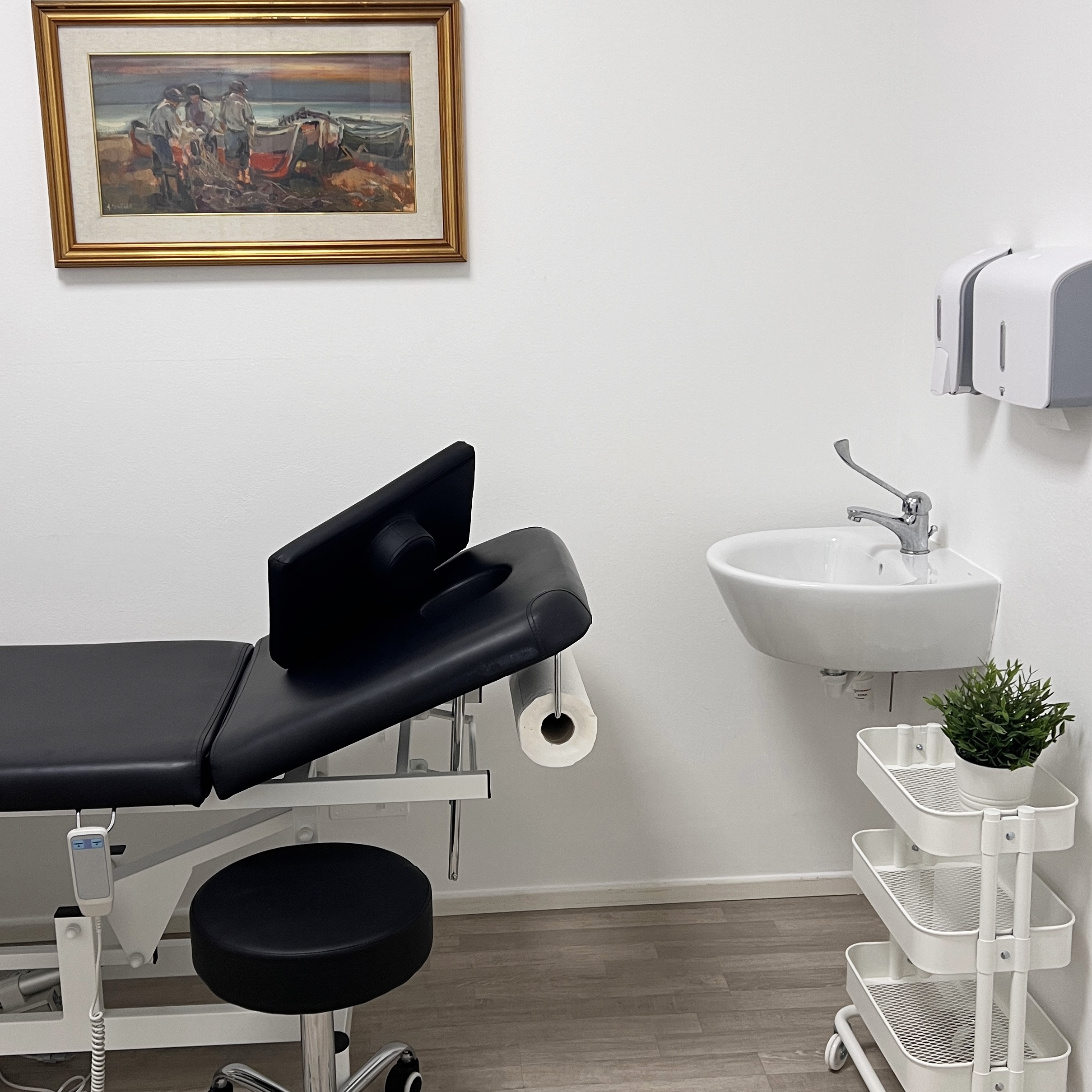 Studio di 8m² arredato con scrivania, lettino elettrico per terapie manuali e lavamani.